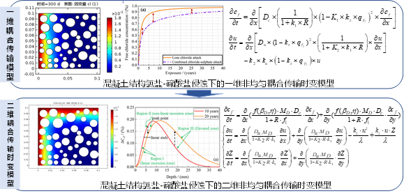 海洋环境中富含的氯离子和硫酸根离子是导致混凝土结构耐久性问题的主要原因,混凝土是时变非均匀的多相材料,且不同的腐蚀性物质在传输过程中存在耦合作用,此外,腐蚀性物质在钢筋表面集聚会导致钢筋锈蚀,进一步加剧混凝土结构的劣化。因此,揭示氯离子和硫酸根离子耦合作用在时变损伤非均匀混凝土中的时变传输机理以及混凝土中钢筋钝化、脱钝和锈蚀作用机理,是实现对钢筋混凝土抗腐蚀性能精准调控的关键。本成果提出的混凝土结构氯盐-硫酸盐侵蚀下一维和二维耦合传输时变模型,可以实现海洋环境中混凝土中的氯离子和硫酸根离子的浓度分布的准确预测,可为混凝土结构耐久性的精准设计提供基础;从多尺度揭示了混凝土中钢筋“钝化-脱钝-锈蚀”全过程机理,明晰了影响混凝土中钢筋腐蚀过程的关键因素,可为混凝土中钢筋腐蚀防护研究提供理论基础。成果可为实现钢筋混凝土抗腐蚀性能的全过程调控提供理论指导。