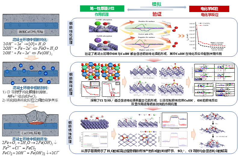 本成果开展了氯离子和硫酸根离子在混凝土中的竞争传输,以及传输至钢筋表面导致钢筋脱钝、锈蚀的全过程作用机理研究。通过揭示氯盐-硫酸盐耦合在时变损伤非均匀混凝土中竞争传输的机理,建立了考虑竞争对抗作用的时间和空间依赖性变化的一维和二维非均匀耦合时变传输模型,并分别提出了氯离子和硫酸根离子的竞争拮抗作用的量化指标ΔCCl和Δstrain,从而提出了混凝土中氯离子和硫酸根离子竞争对抗作用的定量分析方法;进一步对混凝土中钢筋“钝化-脱钝-锈蚀”全过程机理开展了多尺度研究,探明了混凝土孔溶液中CaOH+和OH−在钢筋表面的吸附和致钝过程,验证了混凝土环境中CaOH+吸附对钢筋钝化反应起到了关键作用;结合基于第一性原理和实验方法,揭示了氯离子和硫酸根离子对钝化膜缺陷形成的影响,探明了腐蚀性离子和致钝物质在钢筋表面的竞争吸附过程,从原子层面揭示了混凝土中钢筋的脱钝机理;基于第一性原理揭示了水氧作用下钢筋表面锈蚀产物的形成过程,提出了水解离是形成钢筋锈蚀产物的关键环节,并进一步揭示了氯离子和硫酸根离子对锈蚀产物形成过程的影响机理。最终实现了氯离子和硫酸根离子竞争作用下钢筋混凝土“离子传输-钢筋脱钝-钢筋锈蚀”全过程作用机理的揭示。