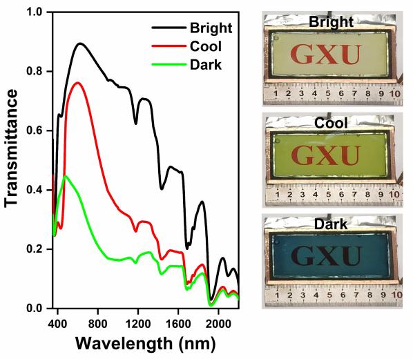 图2 典型电致变色智能窗不同运行模式下的光谱图和数码照片
