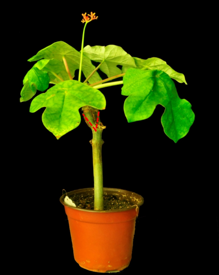 图1 超量表达JcFT的基因工程小桐子(Jatropha curcas)砧木(红色虚线三角以下部分)通过嫁接运输成花素蛋白促进其近缘种佛肚树(J. podagrica)接穗(红色虚线三角以上部分)提前开花