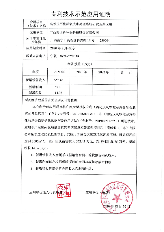 本成果操作简单、成本低廉、实用性强,可预防阻断厌氧颗粒污泥的钙化过程,确保厌氧反应器对高钙废水的长期稳定高效处理。通过积极预防钙在污泥内核沉积、钙化失活,厌氧反应器无需排泥除垢,有效地解决了废纸制浆、食品加工、垃圾渗滤液、发酵废水等领域的高含钙废水处理中因污泥钙化失活导致降低厌氧反应系统处理能力的难题,具有显著应用价值。