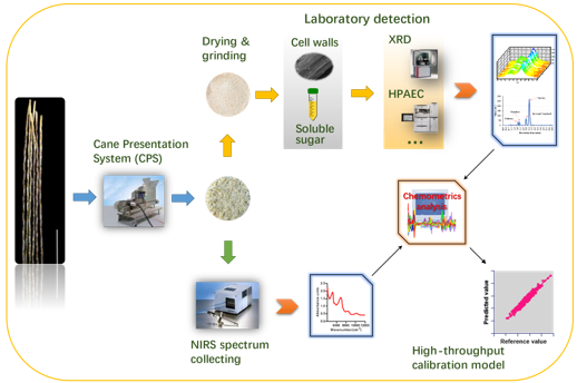 原料蔗按质论价是甘蔗产业适应市场规律实现健康发展的关键举措。但是,蔗茎品质高效快速检测技术是其中的限制性因素。本团队多年致力于蔗茎品质检测技术研发,首次通过将色谱与近红外光谱技术整合,实现了原料蔗品质性状多指标(包括蔗糖分、纤维分、还原糖等关键指标)高通量同步在线检测(样本检测时间不超过1分钟)。该技术利用色谱与光谱在检测领域的优势互补,克服了效率与准确性矛盾的技术瓶颈。经多年优化,目前该技术的检测结果与色谱检测结果相关系数达0.99以上。该技术目前已成功应用于蔗茎品质性状表型组学,累计检测样本超过10万份。
