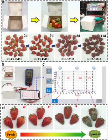 (a-c)草莓品质与多功能复合纸的电阻变化关系;(d-e)手机实时无线监测草莓品质的变化
