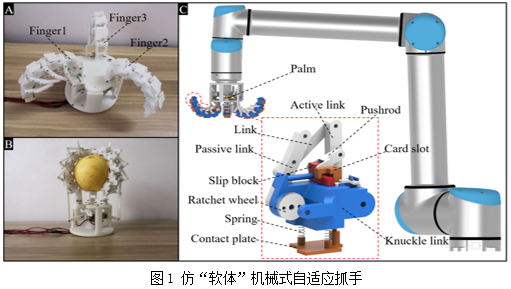 此类抓手是一种面向易碎、易变形物体或动物活体抓取或抓持任务的理想的机械式抓手,我们已在公开发表的论文中将其定义为“GXU-Grasper”,该抓手同时具备以下优点:(1)手指能自适应其有效工作空间内任意轮廓形状的物体(不需要任何传感技术反馈控制,具有软体抓手特征),可满足机器人抓手多样化操作需求;(2)无论手指有多少段指节(指节单元)组成,抓手手指自由度为一;(3)各手指抓持力绝对均匀,并且抓持力理论上只取决于安装于每个指节单元内的弹簧弹性系数;(4)与软体抓手不同,该仿“软体”机械式自适应抓手结构为全刚体机械式结构,承载能力强;(5)抓手可有效抓取易碎易变形物体,亦可无创抓取动物活体;(6)抓手可制作成更小尺寸,抓取细小物体(或活体生物),亦可将抓手制作成更大尺寸,实现任意环境下任意物体或装备的均匀、牢固抓持。