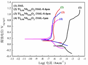 图1 施加和未施加涂层的316L在模拟PEMFC环境(80 oC的0.1mol/L H2SO4水溶液)中的动电位极化曲线