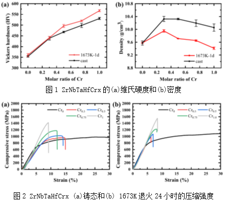 高熵合金由五种及五种以上元素以等摩尔或近等摩尔混合,每种元素的原子百分比在5%~35%之间,又称为多主元合金、复杂成分合金或复杂高浓度合金。目前研究表明高熵合金具有很多优异的物理化学及力学性质,具有重要的理论研究价值和广泛的工业应用前景,可作为高超声速飞行器发动机用高温材料、高性能战斗部材料、抗辐照核能用材料等用于航空航天及核反应堆等重要工业领域。高熵合金已成为目前材料科学研究领域的热点之一。其中难熔高熵合金具有高熔点、高强度、优异的耐腐蚀性能、耐磨性能及高温抗氧化性能。尤其是难熔高熵合金表现出优异高温性能,有望作为超高温结构材料应用于一些特殊领域,备受广泛关注。