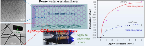 随着全球陆地资源的减少和能源危机的加剧,资源丰富而广袤的海洋成为人们关注的焦点。在海洋探测技术中,水下人工智能技术目前被广泛认为是帮助人类更快地探索水下世界、获取水下资源的手段之一。基于纳米导电填料的柔性传感器件是人工智能技术的关键组成部分,其中大多数应用于可穿戴传感器、人造皮肤和软机器人等先进领域,很少有高性能应变传感器作为潜水服的健康监测。因此,迫切需要开发具有新型结构的高性能、高导电性和环境稳定性的传感器,以应对复杂的环境影响,如水下环境。然而,目前基于纳米填料的涂层导电弹性体和三维网络化导电弹性体都无法满足上述要求。