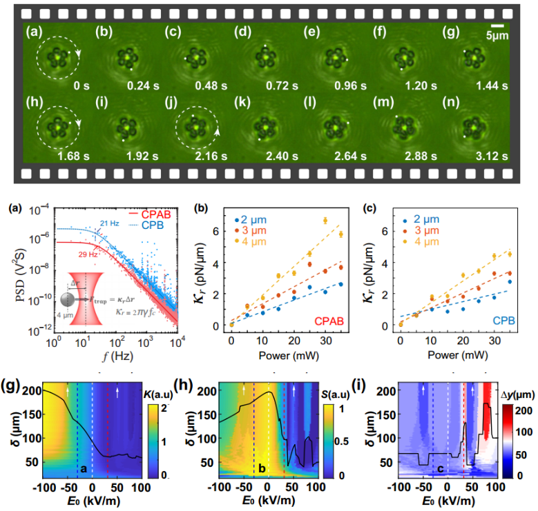 图1 (第一行)叠加 Airy涡旋光场光镊对于多粒子的旋转操纵;(第二行)圆Pearcey Airy光场与圆Pearcey光场的捕获力性能对比;(第三行)部分相干Airy光场在不同相干性和光学非线性中的传输效果
