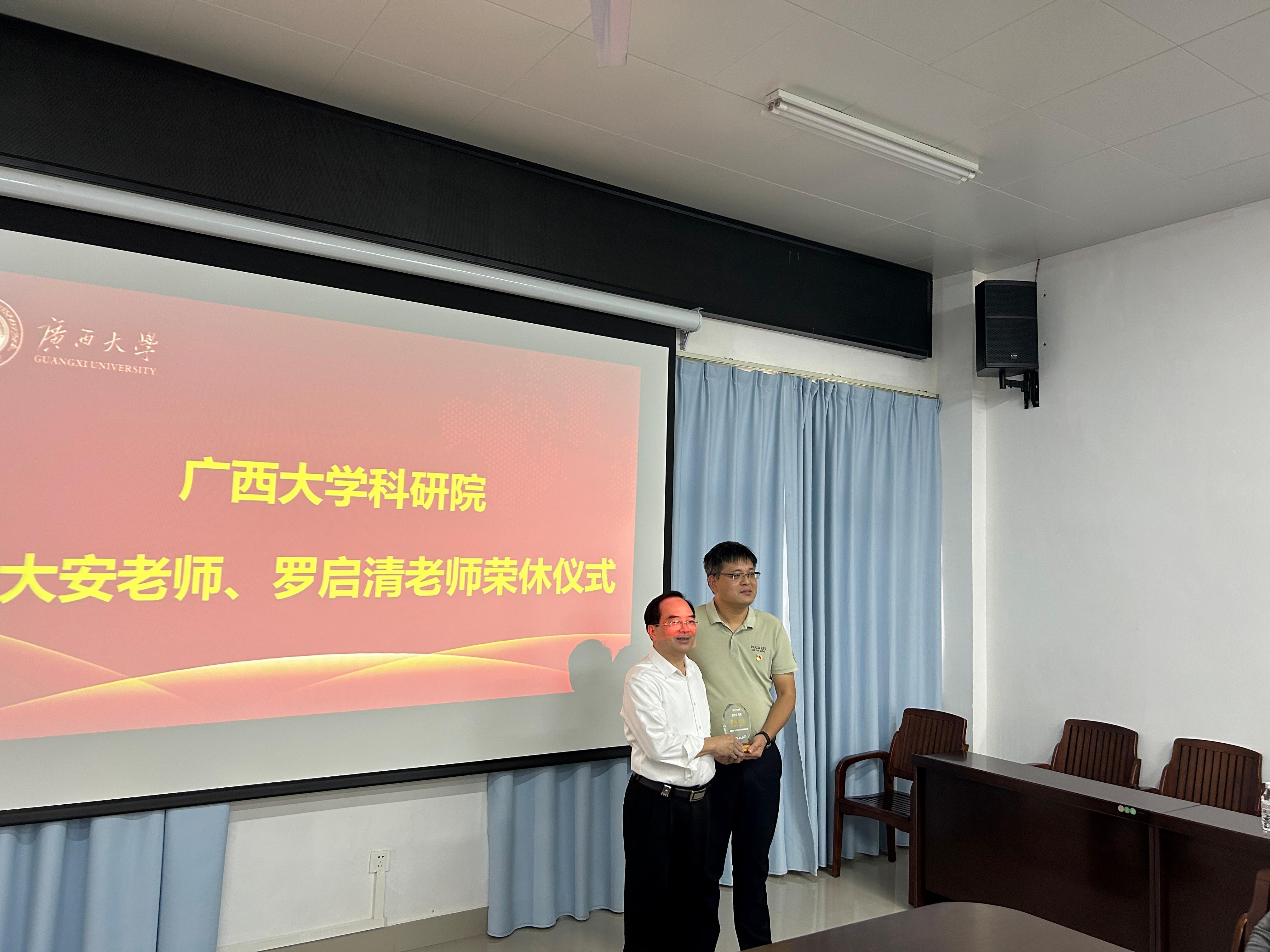 在荣休仪式上,黄大安老师以“感恩”“感谢”“感悟”为主题,回顾了自身三十余年献身西大的主要工作历程,表达了对组织、学校和同事们的感恩感谢之情,并勉励青年同志们珍惜机会,勤奋工作,秉持敬业精神,干一行钻一行精一行。秦祖赠处长主持荣休仪式,多位青年老师对两位荣休老师表达了感谢和美好祝愿。