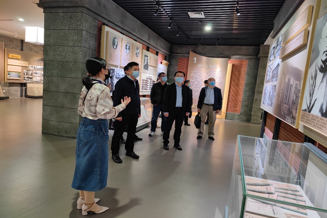 何培俊(左前二)一行参观校史馆,讲解员(左前一)介绍学校发展历程