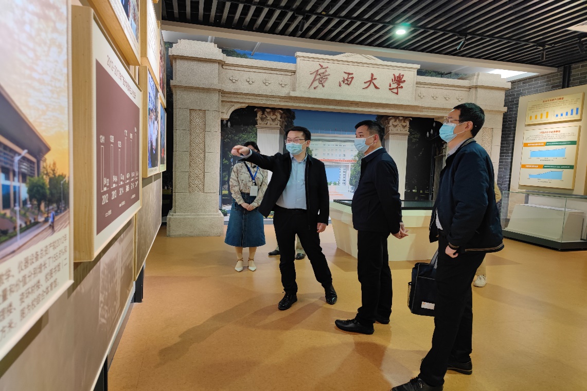 何培俊(左前二)一行参观校史馆,赵双良(左前一)介绍科技成果与人才培养情况