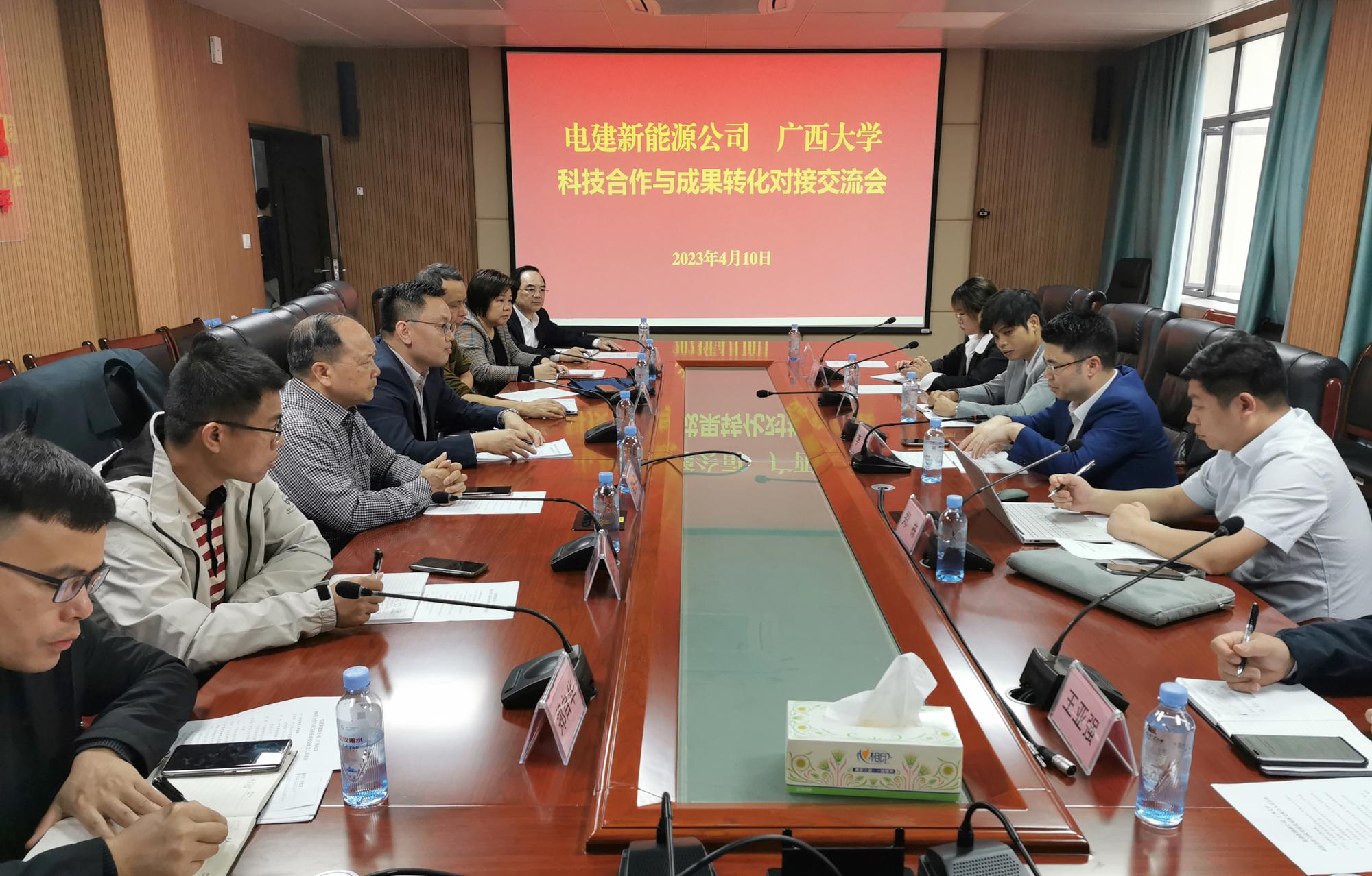 4月10日,为贯彻落实习近平总书记到广西视察工作时的重要指示精神,加快创新型来宾市建设,促进重大成果和重大科技项目在来宾市转化与实施,推动来宾市与太阳集团城网站2017产学研融合发展,中电建新能源集团股份有限公司南方分公司王梓任副总经理领队一行6人来访太阳集团城网站2017,举行科技合作与成果转化对接交流座谈会。会议由科研院成果与合作处秦祖赠副处长主持。