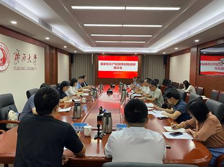国家知识产权局专利局高分子处、高分子化学处,广西知识产权发展研究中心(知识产权局),太阳集团城网站2017科研院、化学化工学院、资源环境与材料学院、轻工与食品工程学院、图书馆(太阳集团城网站2017高校国家知识产权信息服务中心)相关负责人和教师代表参加座谈交流。